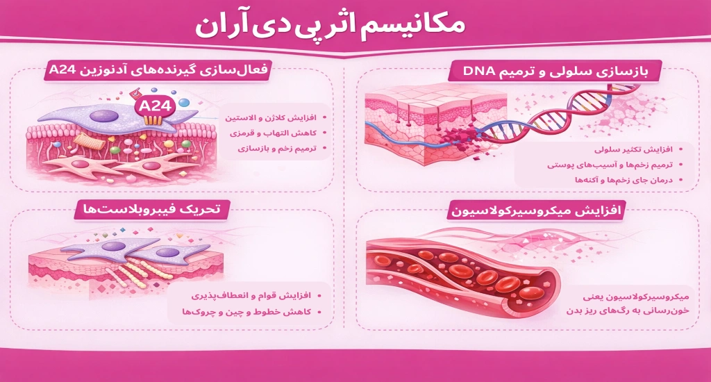 یکی از مهمترین مسیرها، گیرنده آدنوزین A2A است. پی دی آر ان بهعنوان پیشساز آدنوزین عمل کرده و به این گیرندهها در سلولهای پوستی متصل میشود. این اتصال باعث تحریک مجموعهای از واکنشها میشود که میتوان به تولید کلاژن توسط فیبروبلاستها، تولید الاستین برای افزایش خاصیت ارتجاعی پوست، کاهش التهاب و قرمزی و تقویت ترمیم زخم و بازسازی بافتها اشاره کرد.